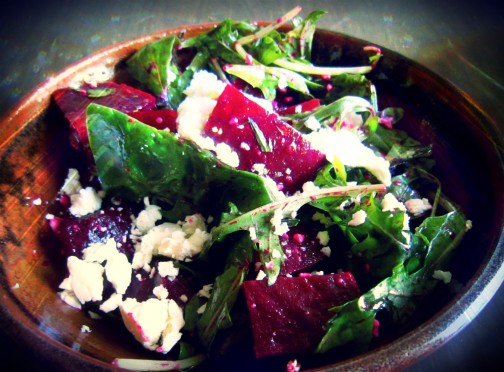 Τοποθετούμε τις φέτες παντζαριού σε μια πιατέλα, περιχύνουμε με τη βινεγκρέτ που έχουμε φτιάξει και πασπαλίζουμε με τη θρυμματισμένη φέτα.