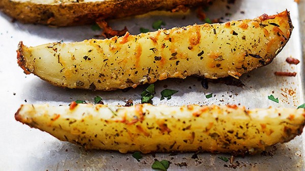 Πασπαλίζουμε τις πατάτες με το μίγμα μπαχαρικών που φτιάξαμε και τις ανακατεύουμε καλά. Τις στρώνουμε στο ταψί με την πλευρά της φλούδας προς τα κάτω και πασπαλίζουμε με την παρμεζάνα.